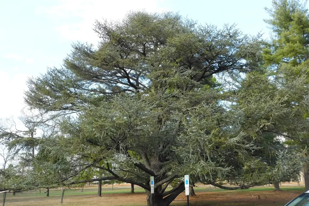 Beyond the gardens, the arboretum includes notable specimens, such as a massive white oak estimated to be more than 250 years old, and distinctive Gould-era plantings, such as the Atlas blue cedar. Many of the trees are among the oldest and largest in Ocean County.